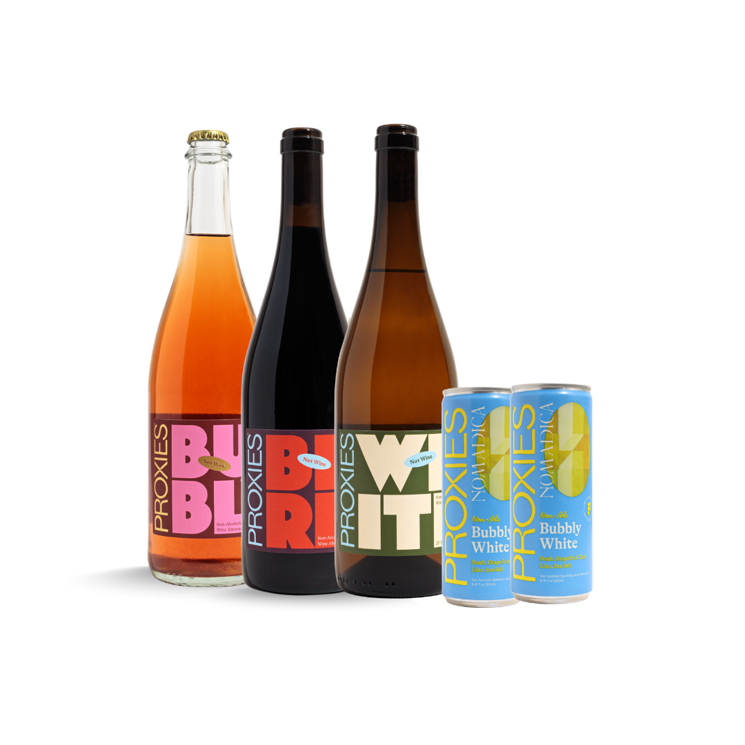 Proxies don’t necessarily taste exactly like any specific wine, but are designed to look, feel, and drink like wine. They have acidity, texture, tannin, and spice and are crafted to pair with food and be enjoyed in wine glasses. Wine, but not.